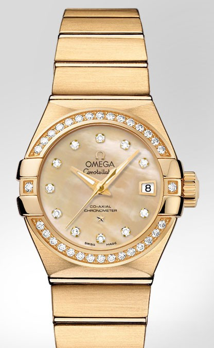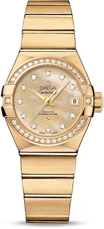 Необычайно эффектный дизайн часов OMEGA Constellation прошел проверку временем. Его характерной особенностью стали знаменитые скобки по бокам часового корпуса и впечатляющие циферблаты. Эта модель имеет перламутровый циферблат цвета шампанского с 11 бриллиантовыми часовыми метками и окошком указателя даты в положении «3 часа». Украшенный бриллиантами безель закреплен на корпусе диаметром 27 мм из 18-каратного желтого золота, который дополнен таким же золотым браслетом. В этой модели используется коаксиальный часовой механизм, калибр 8521, который виден сквозь сапфировое стекло задней крышки корпуса.