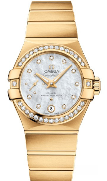 Необычайно эффектный дизайн часов OMEGA Constellation прошел проверку временем. Его характерной особенностью стали знаменитые скобы по бокам часового корпуса и уникальный циферблат. Эта модель имеет белый жемчужный циферблат с 10-ю белыми бриллиантами. В положении "6 часов" находится окошко указателя даты. Безель из желтого золота 18к украшен белыми бриллиантами и закреплен на корпусе диаметром 27 мм из желтого золота 18к, который дополнен золотым браслетом. В часах используется коаксиальный часовой механизм OMEGA, калибр 8520.