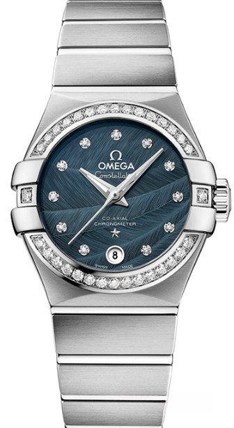 Необычайно эффектный дизайн часов OMEGA Constellation прошел проверку временем. Его характерной особенностью стали знаменитые скобы по бокам часового корпуса и уникальный циферблат. Эта модель имеет лаковый голубой циферблат с перистым узором. Циферблат насчитывает 11 бриллиантовых часовых меток. В положении "6 часов" находится окошко указателя даты. Украшенный бриллиантами стальной безель закреплен на корпусе диаметром 27 мм из нержавеющей стали, который дополнен стальным браслетом. В часах используется коаксиальный часовой механизм OMEGA, калибр 8520.