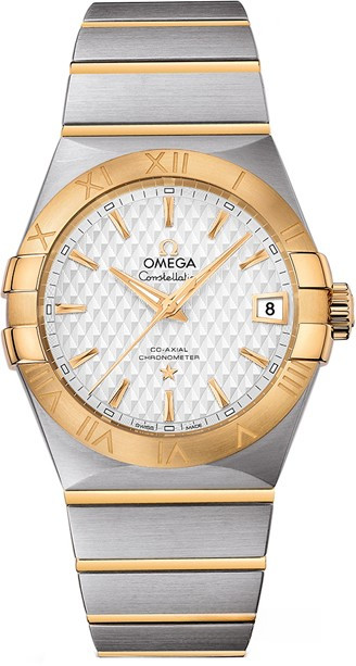 Необычайно эффектный дизайн часов OMEGA Constellation прошел проверку временем. Его характерной особенностью стали знаменитые скобки по бокам часового корпуса и уникальный циферблат. Данная модель имеет белый циферблат с рельефным узором в виде ромбов и окошком указателя даты в положении «3 часа». Ее безель из 18-каратного желтого золота с выгравированными римскими цифрами закреплен на корпусе диаметром 38 мм из нержавеющей стали, который дополнен браслетом из нержавеющей стали и 18-каратного желтого золота. В этой модели используется коаксиальный часовой механизм OMEGA, калибр 8500, который виден сквозь сапфировое стекло задней крышки корпуса.