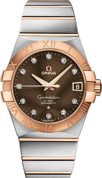 Необычайно эффектный дизайн часов OMEGA Constellation прошел проверку временем. Его характерной особенностью стали знаменитые скобки по бокам часового корпуса и впечатляющие циферблаты. Эта модель имеет украшенный бриллиантовыми часовыми метками коричневый циферблат с окошком указателя даты в положении «3 часа» и устойчивым к царапинам сапфировым стеклом. Безель из 18-каратного розового золота с выгравированными римскими цифрами закреплен на корпусе диаметром 38 мм из нержавеющей стали, который дополнен браслетом из нержавеющей стали и 18-каратного розового золота. В этих изысканных часах используется коаксиальный часовой механизм OMEGA, калибр 8500, который виден сквозь прозрачную заднюю крышку корпуса.