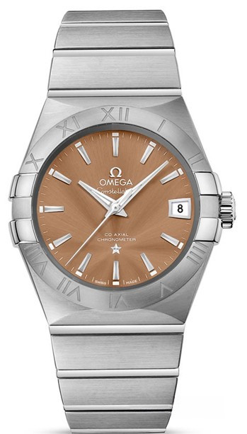 Необычайно эффектный дизайн часов OMEGA Constellation прошел проверку временем. Его характерной особенностью стали знаменитые скобки по бокам часового корпуса и уникальный циферблат. Данная модель имеет коричневый циферблат с окошком указателя даты в положении «3 часа». Ее безель из нержавеющей стали закреплен на корпусе диаметром 38 мм из нержавеющей стали, который дополнен браслетом из нержавеющей стали. В этой модели используется коаксиальный часовой механизм OMEGA, калибр 8500, который виден сквозь сапфировое стекло задней крышки корпуса.