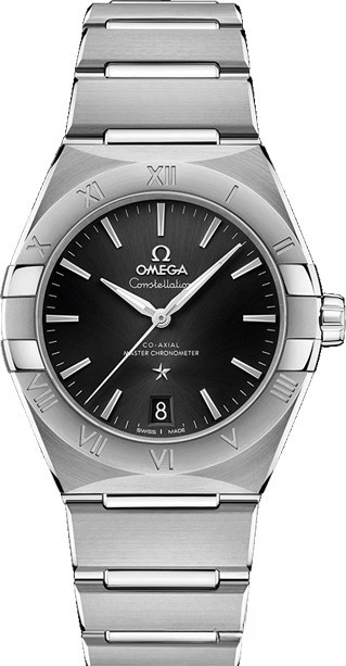 Характерными элементами выразительного и всегда актуального дизайна часов OMEGA Constellation являются узнаваемые полукруглые скосы вверху и внизу корпуса, боковые "скобки" и интегрированный браслет. Модель из нержавеющей стали имеет корпус диаметром 36 мм, безель с выгравированными римскими цифрами, черный циферблат с радиальным сатинированием и окошком указателя даты в положении "6 часов". Стрелки, логотип OMEGA, звезда Constellation и индексы выполнены из 18-каратного белого золота. Часы оснащены калибром OMEGA Co-Axial Master Chronometer 8800, который можно рассмотреть сквозь устойчивое к царапинам выпуклое сапфировое стекло задней крышки корпуса.