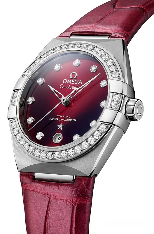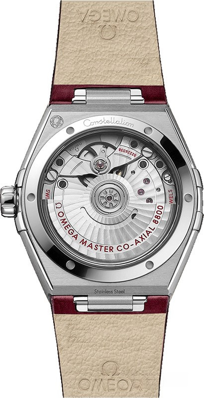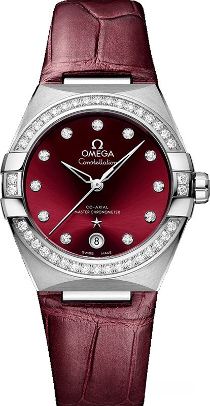 Характерными элементами выразительного и всегда актуального дизайна часов OMEGA Constellation являются узнаваемые полукруглые скосы вверху и внизу корпуса, боковые "скобки" и интегрированный ремешок. Модель из нержавеющей стали имеет корпус диаметром 36 мм, безель из белых бриллиантов, бордовый циферблат с окошком указателя даты в положении "6 часов" и 11-ю белыми бриллиантами. Часы оснащены Калибром OMEGA Co-Axial Master Chronometer 8800, который можно рассмотреть сквозь устойчивое к царапинам выпуклое сапфировое стекло задней крышки корпуса.
