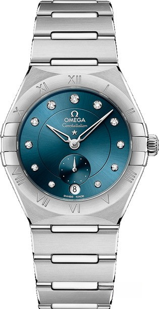 Часы Omega Constellation Co-Axial Master Chronometer Small Seconds 34 mm представлены в корпусе из нержавеющей стали размером 34 мм водонепроницаемостью 50 метров. Внутри корпуса установлен автоматический механизм, Калибр 8802, обладающий запасом хода 55 часов. На синем циферблате с 11-ю белыми бриллиантами отображаются часы, минуты, секунды, дата. Часы поставляются на браслете из нержавеющей стали.