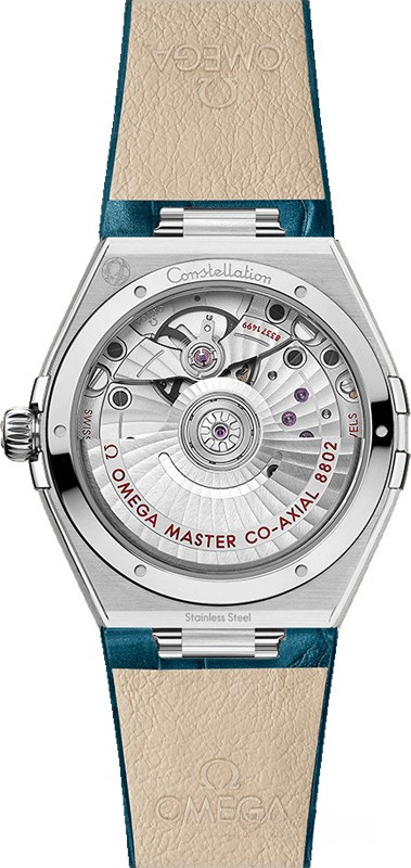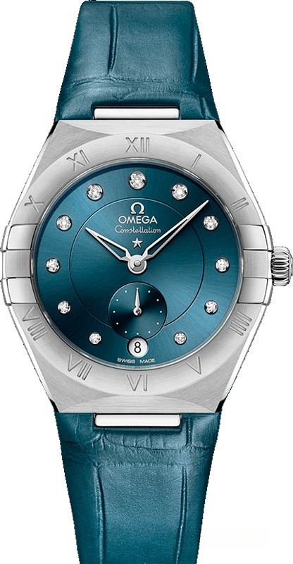 Часы Omega Constellation Co-Axial Master Chronometer Small Seconds 34 mm представлены в корпусе из нержавеющей стали размером 34 мм водонепроницаемостью 50 метров. Внутри корпуса установлен автоматический механизм, Калибр 8802, обладающий запасом хода 55 часов. На синем циферблате с 11-ю белыми бриллиантами отображаются часы, минуты, секунды, дата. Часы поставляются на ремешке из кожи аллигатора с вставкой из нержавеющей стали.