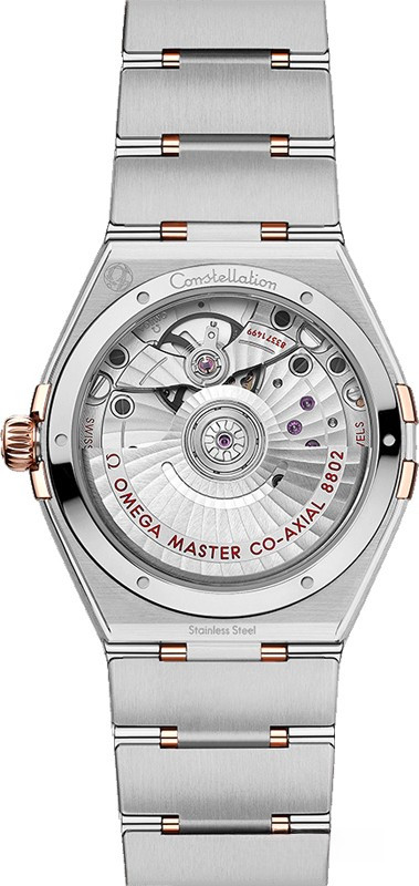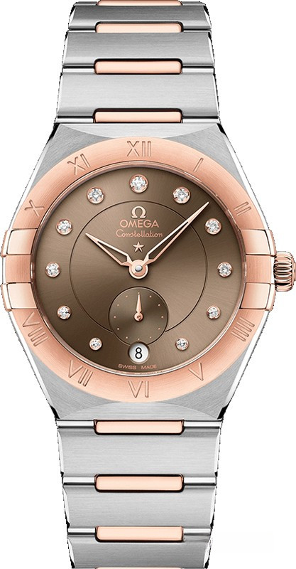 Часы Omega Constellation Co-Axial Master Chronometer Small Seconds 34 mm представлены в корпусе из нержавеющей стали и розового золота 18к размером 34 мм водонепроницаемостью 50 метров. Внутри корпуса установлен автоматический механизм, Калибр 8802, обладающий запасом хода 55 часов. На коричневом циферблате с 11-ю белыми бриллиантами отображаются часы, минуты, секунды, дата. Часы поставляются на браслете из нержавеющей стали и розового золота 18к.