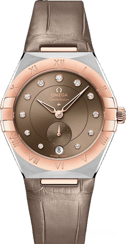 Часы Omega Constellation Co-Axial Master Chronometer Small Seconds 34 mm представлены в корпусе из нержавеющей стали и розового золота 18к размером 34 мм водонепроницаемостью 50 метров. Внутри корпуса установлен автоматический механизм, Калибр 8802, обладающий запасом хода 55 часов. На коричневом циферблате с 11-ю белыми бриллиантами отображаются часы, минуты, секунды, дата. Часы поставляются на ремешке из кожи аллигатора с вставкой из нержавеющей стали.