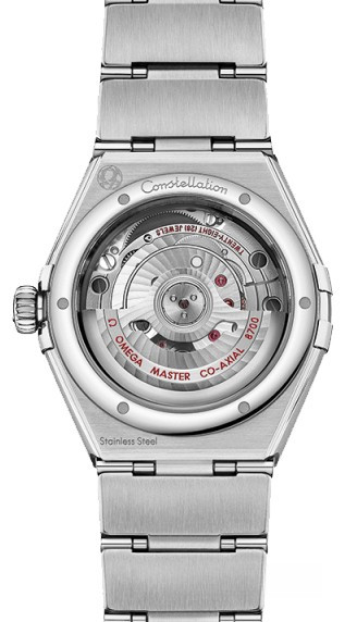 Характерными элементами выразительного и всегда актуального дизайна часов OMEGA Constellation являются узнаваемые полукруглые скосы вверху и внизу корпуса, боковые "скобки" и интегрированный браслет. Модель из нержавеющей стали имеет корпус диаметром 29 мм, безель с выгравированными римскими цифрами и перламутровый циферблат с окошком указателя даты в положении "6 часов". Стрелки, логотип OMEGA, звезда Constellation и индексы выполнены из 18-каратного белого золота. В часы установлен механизм OMEGA Co-Axial Master Chronometer 8700, который виден сквозь устойчивое к царапинам выпуклое сапфировое стекло задней крышки корпуса.