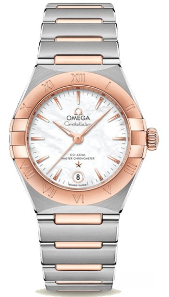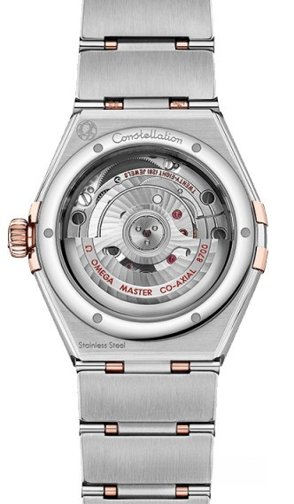 Характерными элементами выразительного и всегда актуального дизайна часов OMEGA Constellation являются узнаваемые полукруглые скосы вверху и внизу корпуса, боковые "скобки" и интегрированный браслет. Модель из 18-каратного золота Sedna™ и нержавеющей стали имеет корпус диаметром 29 мм, безель с выгравированными римскими цифрами и перламутровый циферблат с окошком указателя даты в положении "6 часов". Стрелки, логотип OMEGA, звезда Constellation и индексы также выполнены из 18-каратного золота Sedna™. В часы установлен механизм OMEGA Co-Axial Master Chronometer 8700, который виден сквозь устойчивое к царапинам выпуклое сапфировое стекло задней крышки корпуса.