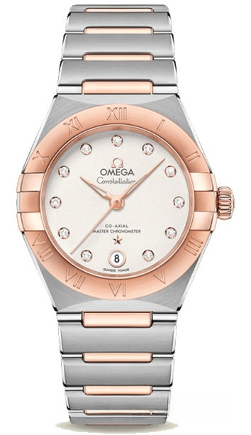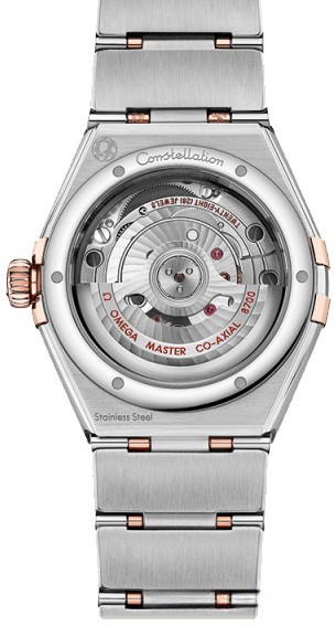 Характерными элементами выразительного и всегда актуального дизайна часов OMEGA Constellation являются узнаваемые полукруглые скосы вверху и внизу корпуса, боковые "скобки" и интегрированный браслет. Модель из 18-каратного золота Sedna™ и нержавеющей стали имеет корпус диаметром 29 мм, безель с выгравированными римскими цифрами и серебристо-белый циферблат с бриллиантовыми часовыми индексами и окошком указателя даты в положении "6 часов". Стрелки, логотип OMEGA, звезда Constellation и оправа бриллиантов также выполнены из 18-каратного золота Sedna™. В часы установлен механизм OMEGA Co-Axial Master Chronometer 8700, который виден сквозь устойчивое к царапинам выпуклое сапфировое стекло задней крышки корпуса.