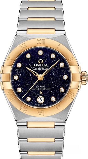 Характерными элементами выразительного и всегда актуального дизайна часов OMEGA Constellation являются узнаваемые полукруглые скосы вверху и внизу корпуса, боковые "скобки" и интегрированный браслет. Модель из нержавеющей стали и желтого золота 18к имеет корпус диаметром 29 мм, циферблат из синего авантюрина с бриллиантовыми часовыми индексами и окошком указателя даты в положении "6 часов". В часы установлен механизм OMEGA Co-Axial Master Chronometer 8701, который виден сквозь устойчивое к царапинам выпуклое сапфировое стекло задней крышки корпуса. Часы комплектуются браслетом из нержавеющей стали и желтого золота 18к.