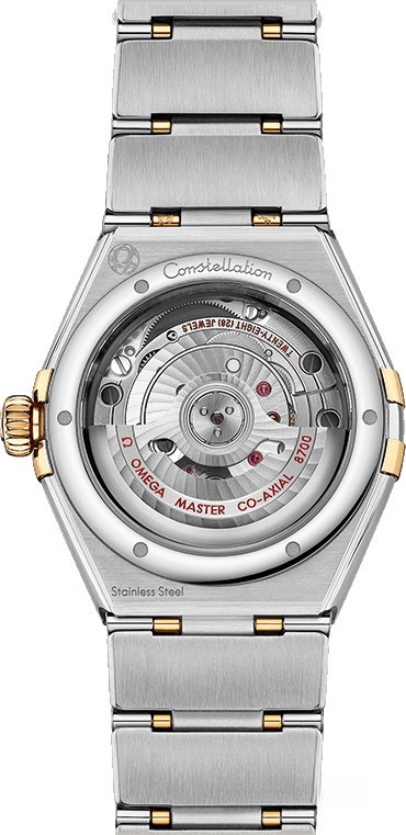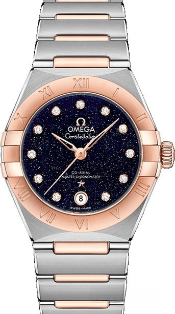 Характерными элементами выразительного и всегда актуального дизайна часов OMEGA Constellation являются узнаваемые полукруглые скосы вверху и внизу корпуса, боковые "скобки" и интегрированный браслет. Модель из нержавеющей стали и розового золота 18к имеет корпус диаметром 29 мм, циферблат из синего авантюрина с бриллиантовыми часовыми индексами и окошком указателя даты в положении "6 часов". В часы установлен механизм OMEGA Co-Axial Master Chronometer 8701, который виден сквозь устойчивое к царапинам выпуклое сапфировое стекло задней крышки корпуса. Часы комплектуются браслетом из нержавеющей стали и розового золота 18к.