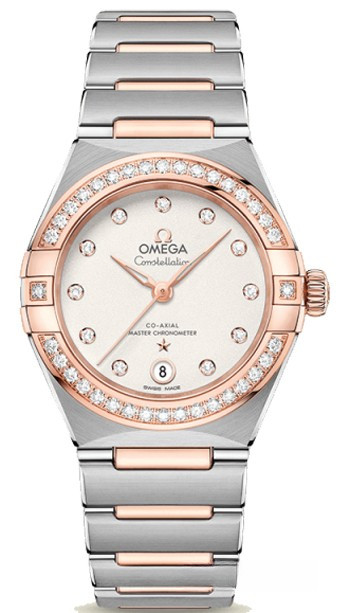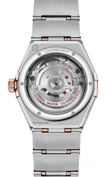 Характерными элементами выразительного и всегда актуального дизайна часов OMEGA Constellation являются узнаваемые полукруглые скосы вверху и внизу корпуса, боковые "скобки" и интегрированный браслет. Модель из 18-каратного золота Sedna™ и нержавеющей стали имеет корпус диаметром 29 мм, инкрустированный бриллиантами безель и серебристо-белый циферблат с бриллиантовыми часовыми индексами и окошком указателя даты в положении "6 часов". Стрелки, логотип OMEGA, звезда Constellation и оправа бриллиантов также выполнены из 18-каратного золота Sedna™. В часы установлен механизм OMEGA Co-Axial Master Chronometer 8700, который виден сквозь устойчивое к царапинам выпуклое сапфировое стекло задней крышки корпуса.