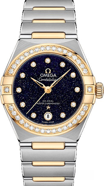 Характерными элементами выразительного и всегда актуального дизайна часов OMEGA Constellation являются узнаваемые полукруглые скосы вверху и внизу корпуса, боковые "скобки" и интегрированный браслет. Модель из нержавеющей стали и желтого золота 18к имеет корпус диаметром 29 мм, циферблат из синего авантюрина с бриллиантовыми часовыми индексами и окошком указателя даты в положении "6 часов". В часы установлен механизм OMEGA Co-Axial Master Chronometer 8701, который виден сквозь устойчивое к царапинам выпуклое сапфировое стекло задней крышки корпуса. Часы комплектуются браслетом из нержавеющей стали и желтого золота 18к. Безель из белых бриллиантов.