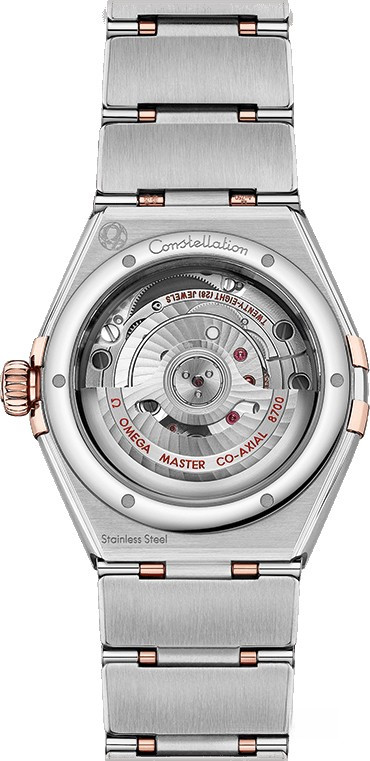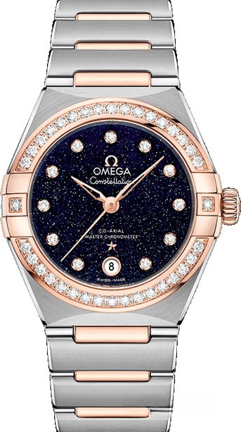 Характерными элементами выразительного и всегда актуального дизайна часов OMEGA Constellation являются узнаваемые полукруглые скосы вверху и внизу корпуса, боковые "скобки" и интегрированный браслет. Модель из нержавеющей стали и розового золота 18к имеет корпус диаметром 29 мм, циферблат из синего авантюрина с бриллиантовыми часовыми индексами и окошком указателя даты в положении "6 часов". В часы установлен механизм OMEGA Co-Axial Master Chronometer 8701, который виден сквозь устойчивое к царапинам выпуклое сапфировое стекло задней крышки корпуса. Часы комплектуются браслетом из нержавеющей стали и розового золота 18к. Безель из белых бриллиантов.
