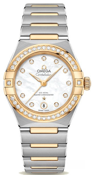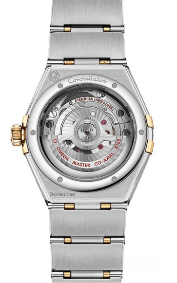 Характерными элементами выразительного и всегда актуального дизайна часов OMEGA Constellation являются узнаваемые полукруглые скосы вверху и внизу корпуса, боковые "скобки" и интегрированный браслет. Модель из 18-каратного желтого золота и нержавеющей стали имеет корпус диаметром 29 мм, инкрустированный бриллиантами безель и перламутровый циферблат с бриллиантовыми часовыми индексами и окошком указателя даты в положении "6 часов". Стрелки, логотип OMEGA, звезда Constellation и оправа бриллиантов также выполнены из 18-каратного желтого золота. В часы установлен механизм OMEGA Co-Axial Master Chronometer 8700, который виден сквозь устойчивое к царапинам выпуклое сапфировое стекло задней крышки корпуса.