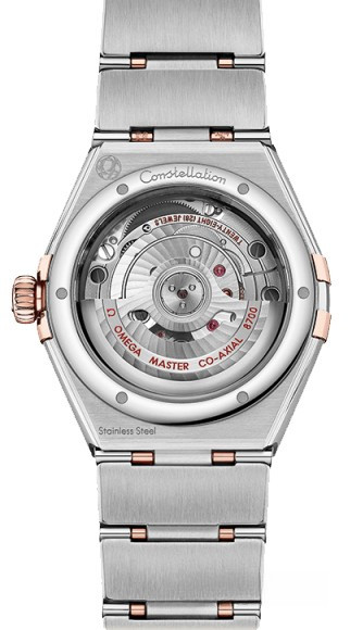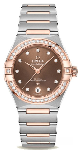 Характерными элементами выразительного и всегда актуального дизайна часов OMEGA Constellation являются узнаваемые полукруглые скосы вверху и внизу корпуса, боковые "скобки" и интегрированный браслет. Модель из 18-каратного золота Sedna™ и нержавеющей стали имеет корпус диаметром 29 мм, инкрустированный бриллиантами безель и коричневый циферблат с узором "солнечные лучи", бриллиантовыми часовыми индексами и окошком указателя даты в положении "6 часов". Стрелки, логотип OMEGA, звезда Constellation и оправа бриллиантов также выполнены из 18-каратного золота Sedna™. В часы установлен механизм OMEGA Co-Axial Master Chronometer 8700, который виден сквозь устойчивое к царапинам выпуклое сапфировое стекло задней крышки корпуса.