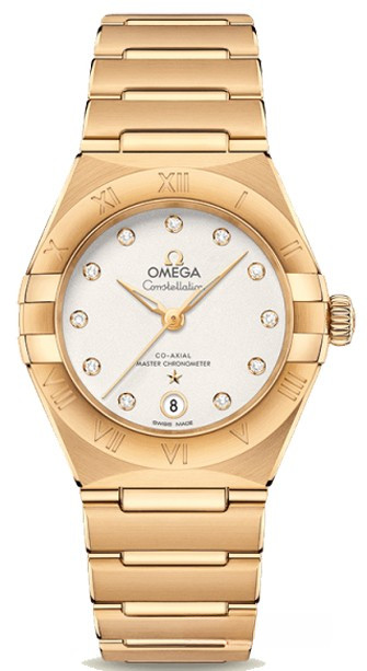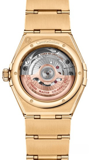 Характерными элементами выразительного и всегда актуального дизайна часов OMEGA Constellation являются узнаваемые полукруглые скосы вверху и внизу корпуса, боковые "скобки" и интегрированный браслет. Модель из 18-каратного желтого золота имеет корпус диаметром 29 мм, безель с выгравированными римскими цифрами и серебристо-белый циферблат с бриллиантовыми часовыми индексами и окошком указателя даты в положении "6 часов". Браслет, стрелки, логотип OMEGA, звезда Constellation и оправа бриллиантов также выполнены из 18-каратного желтого золота. В часы установлен механизм OMEGA Co-Axial Master Chronometer 8701, который виден сквозь устойчивое к царапинам выпуклое сапфировое стекло задней крышки корпуса.
