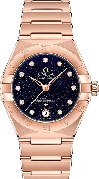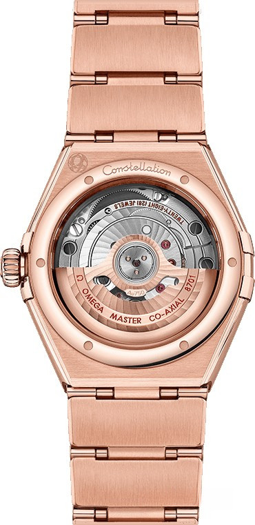 Характерными элементами выразительного и всегда актуального дизайна часов OMEGA Constellation являются узнаваемые полукруглые скосы вверху и внизу корпуса, боковые "скобки" и интегрированный браслет. Модель из розового золота 18к имеет корпус диаметром 29 мм, циферблат из синего авантюрина с бриллиантовыми часовыми индексами и окошком указателя даты в положении "6 часов". В часы установлен механизм OMEGA Co-Axial Master Chronometer 8701, который виден сквозь устойчивое к царапинам выпуклое сапфировое стекло задней крышки корпуса. Часы комплектуются браслетом из розового золота 18к.