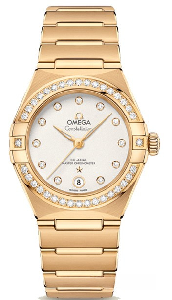 Характерными элементами выразительного и всегда актуального дизайна часов OMEGA Constellation являются узнаваемые полукруглые скосы вверху и внизу корпуса, боковые "скобки" и интегрированный браслет. Модель из 18-каратного желтого золота имеет корпус диаметром 29 мм, инкрустированный бриллиантами безель и серебристо-белый циферблат с бриллиантовыми часовыми индексами и окошком указателя даты в положении "6 часов". Браслет, стрелки, логотип OMEGA, звезда Constellation и оправа бриллиантов также выполнены из 18-каратного желтого золота. В часы установлен механизм OMEGA Co-Axial Master Chronometer 8701, который виден сквозь устойчивое к царапинам выпуклое сапфировое стекло задней крышки корпуса.
