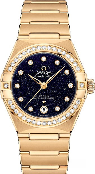Характерными элементами выразительного и всегда актуального дизайна часов OMEGA Constellation являются узнаваемые полукруглые скосы вверху и внизу корпуса, боковые "скобки" и интегрированный браслет. Модель из желтого золота 18к имеет корпус диаметром 29 мм, циферблат из синего авантюрина с бриллиантовыми часовыми индексами и окошком указателя даты в положении "6 часов". В часы установлен механизм OMEGA Co-Axial Master Chronometer 8701, который виден сквозь устойчивое к царапинам выпуклое сапфировое стекло задней крышки корпуса. Часы комплектуются браслетом из желтого золота 18к. Безель из белых бриллиантов.