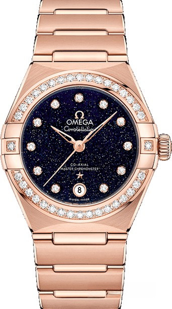 Характерными элементами выразительного и всегда актуального дизайна часов OMEGA Constellation являются узнаваемые полукруглые скосы вверху и внизу корпуса, боковые "скобки" и интегрированный браслет. Модель из розового золота 18к имеет корпус диаметром 29 мм, циферблат из синего авантюрина с бриллиантовыми часовыми индексами и окошком указателя даты в положении "6 часов". В часы установлен механизм OMEGA Co-Axial Master Chronometer 8701, который виден сквозь устойчивое к царапинам выпуклое сапфировое стекло задней крышки корпуса. Часы комплектуются браслетом из розового золота 18к. Безель из белых бриллиантов.