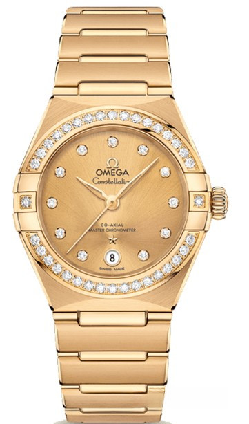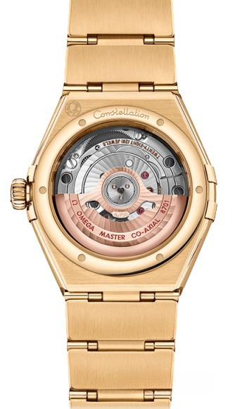 Характерными элементами выразительного и всегда актуального дизайна часов OMEGA Constellation являются узнаваемые полукруглые скосы вверху и внизу корпуса, боковые "скобки" и интегрированный браслет. Модель из 18-каратного желтого золота имеет корпус диаметром 29 мм, инкрустированный бриллиантами безель и циферблат цвета шампанского с узором "солнечные лучи", бриллиантовыми часовыми индексами и окошком указателя даты в положении "6 часов". Браслет, стрелки, логотип OMEGA, звезда Constellation и оправа бриллиантов также выполнены из 18-каратного желтого золота. В часы установлен механизм OMEGA Co-Axial Master Chronometer 8701, который виден сквозь устойчивое к царапинам выпуклое сапфировое стекло задней крышки корпуса.