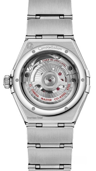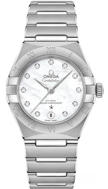 Характерными элементами выразительного и всегда актуального дизайна часов OMEGA Constellation являются узнаваемые полукруглые скосы вверху и внизу корпуса, боковые "скобки" и интегрированный браслет. Модель из нержавеющей стали имеет корпус диаметром 29 мм, безель с выгравированными римскими цифрами и перламутровый циферблат с бриллиантовыми часовыми индексами и окошком указателя даты в положении "6 часов". Стрелки, логотип OMEGA, звезда Constellation и оправа бриллиантов выполнены из 18-каратного белого золота. В часы установлен механизм OMEGA Co-Axial Master Chronometer 8700, который виден сквозь устойчивое к царапинам выпуклое сапфировое стекло задней крышки корпуса.