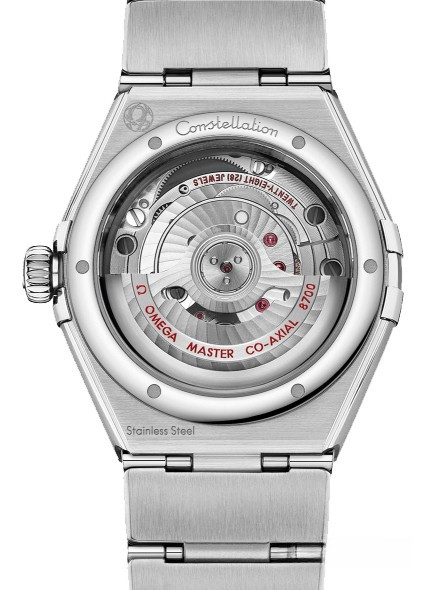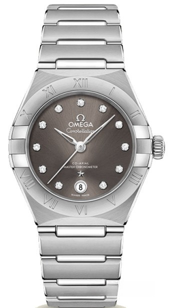 Характерными элементами выразительного и всегда актуального дизайна часов OMEGA Constellation являются узнаваемые полукруглые скосы вверху и внизу корпуса, боковые "скобки" и интегрированный браслет. Модель из нержавеющей стали имеет корпус диаметром 29 мм, безель с выгравированными римскими цифрами и серый циферблат с узором "солнечные лучи", бриллиантовыми часовыми индексами и окошком указателя даты в положении "6 часов". Стрелки, логотип OMEGA, звезда Constellation и оправа бриллиантов выполнены из 18-каратного белого золота. В часы установлен механизм OMEGA Co-Axial Master Chronometer 8700, который виден сквозь устойчивое к царапинам выпуклое сапфировое стекло задней крышки корпуса.