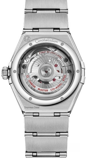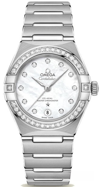 Характерными элементами выразительного и всегда актуального дизайна часов OMEGA Constellation являются узнаваемые полукруглые скосы вверху и внизу корпуса, боковые "скобки" и интегрированный браслет. Модель из нержавеющей стали имеет корпус диаметром 29 мм, инкрустированный бриллиантами безель и перламутровый циферблат с бриллиантовыми часовыми индексами и окошком указателя даты в положении "6 часов". Стрелки, логотип OMEGA, звезда Constellation и оправа бриллиантов выполнены из 18-каратного белого золота. В часы установлен механизм OMEGA Co-Axial Master Chronometer 8700, который виден сквозь устойчивое к царапинам выпуклое сапфировое стекло задней крышки корпуса.