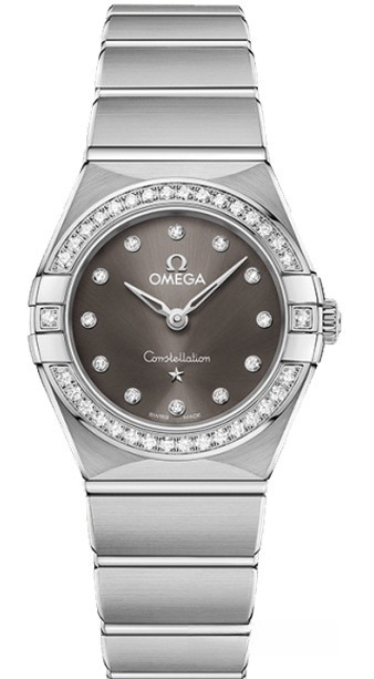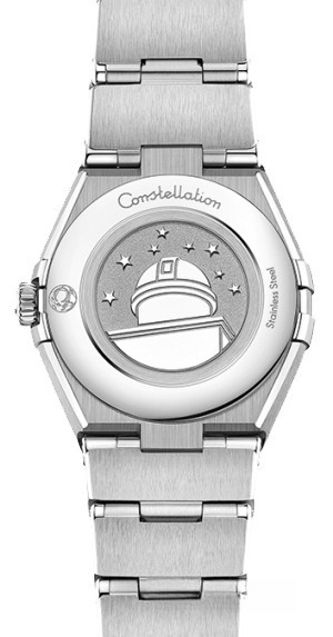 Характерными элементами выразительного и всегда актуального дизайна часов OMEGA Constellation являются узнаваемые полукруглые скосы вверху и внизу корпуса, боковые "скобки" и интегрированный браслет. Модель из нержавеющей стали имеет корпус диаметром 25 мм, инкрустированный бриллиантами безель, серый циферблат с узором "солнечные лучи", бриллиантовые часовые индексы и устойчивое к царапинам сапфировое стекло. Стрелки, логотип OMEGA, звезда Constellation и оправа бриллиантов выполнены из 18-каратного белого золота. В часы установлен механизм OMEGA 4061, а их заднюю крышку украшает рельефный медальон с изображением обсерватории.