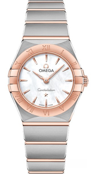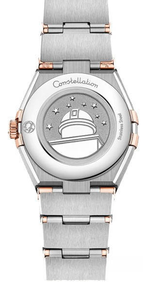 Характерными элементами выразительного и всегда актуального дизайна часов OMEGA Constellation являются узнаваемые полукруглые скосы вверху и внизу корпуса, боковые "скобки" и интегрированный браслет. Модель из 18-каратного золота Sedna™ и нержавеющей стали имеет корпус диаметром 25 мм, безель с выгравированными римскими цифрами, белый перламутровый циферблат и устойчивое к царапинам сапфировое стекло. Стрелки, логотип OMEGA, звезда Constellation и индексы также выполнены из 18-каратного золота Sedna™. В часы установлен механизм OMEGA 4061, а их заднюю крышку украшает рельефный медальон с изображением обсерватории.