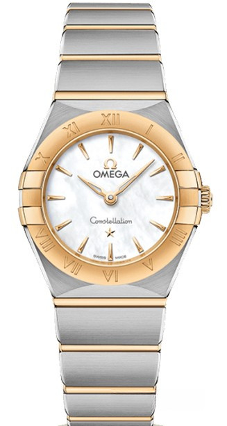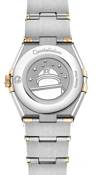 Характерными элементами выразительного и всегда актуального дизайна часов OMEGA Constellation являются узнаваемые полукруглые скосы вверху и внизу корпуса, боковые "скобки" и интегрированный браслет. Модель из 18-каратного желтого золота и нержавеющей стали имеет корпус диаметром 25 мм, безель с выгравированными римскими цифрами, белый перламутровый циферблат и устойчивое к царапинам сапфировое стекло. Стрелки, логотип OMEGA, звезда Constellation и индексы также выполнены из 18-каратного желтого золота. В часы установлен механизм OMEGA 4061, а их заднюю крышку украшает рельефный медальон с изображением обсерватории.