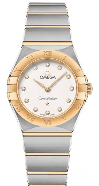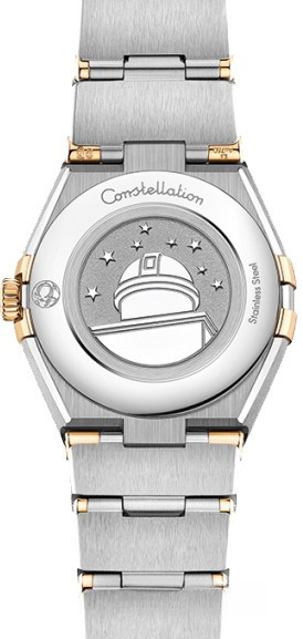Характерными элементами выразительного и всегда актуального дизайна часов OMEGA Constellation являются узнаваемые полукруглые скосы вверху и внизу корпуса, боковые "скобки" и интегрированный браслет. Модель из 18-каратного желтого золота и нержавеющей стали имеет корпус диаметром 25 мм, безель с выгравированными римскими цифрами, серебристо-белый циферблат с бриллиантовыми часовыми индексами и устойчивое к царапинам сапфировое стекло. Стрелки, логотип OMEGA, звезда Constellation и оправа бриллиантов также выполнены из 18-каратного желтого золота. В часы установлен механизм OMEGA 4061, а их заднюю крышку украшает рельефный медальон с изображением обсерватории.