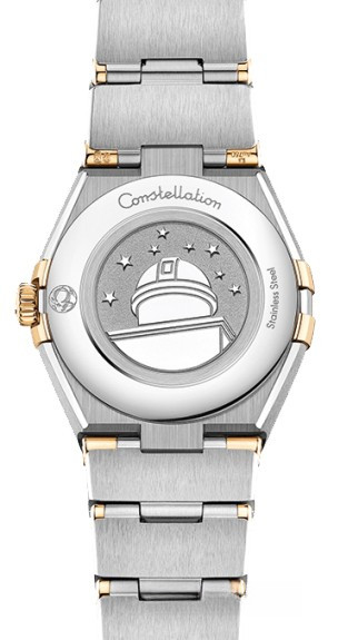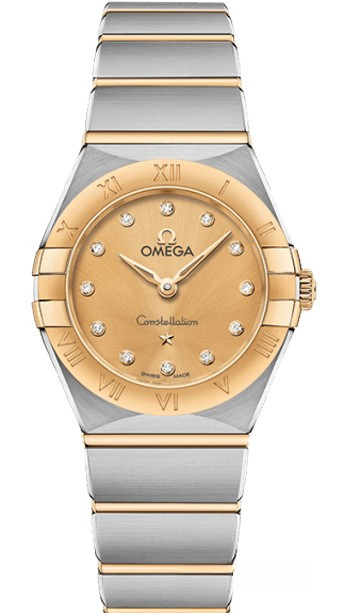 Характерными элементами выразительного и всегда актуального дизайна часов OMEGA Constellation являются узнаваемые полукруглые скосы вверху и внизу корпуса, боковые "скобки" и интегрированный браслет. Модель из 18-каратного желтого золота и нержавеющей стали имеет корпус диаметром 25 мм, безель с выгравированными римскими цифрами, циферблат цвета шампанского с узором "солнечные лучи", бриллиантовые часовые индексы и устойчивое к царапинам сапфировое стекло. Стрелки, логотип OMEGA, звезда Constellation и оправа бриллиантов также выполнены из 18-каратного желтого золота. В часы установлен механизм OMEGA 4061, а их заднюю крышку украшает рельефный медальон с изображением обсерватории.