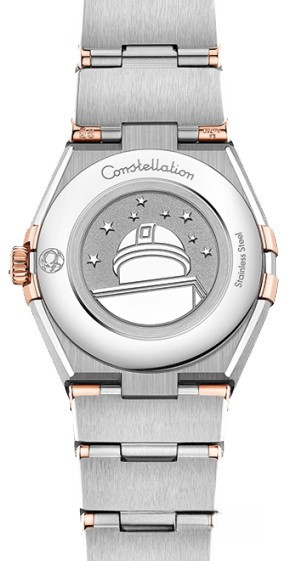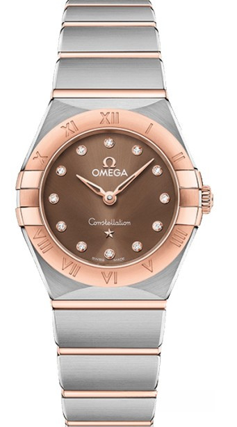 Характерными элементами выразительного и всегда актуального дизайна часов OMEGA Constellation являются узнаваемые полукруглые скосы вверху и внизу корпуса, боковые "скобки" и интегрированный браслет. Модель из 18-каратного золота Sedna™ и нержавеющей стали имеет корпус диаметром 25 мм, безель с выгравированными римскими цифрами, коричневый циферблат с узором "солнечные лучи" и устойчивое к царапинам сапфировое стекло. Стрелки, логотип OMEGA, звезда Constellation и оправа бриллиантов также выполнены из 18-каратного золота Sedna™. В часы установлен механизм OMEGA 4061, а их заднюю крышку украшает рельефный медальон с изображением обсерватории.