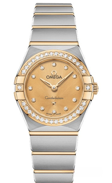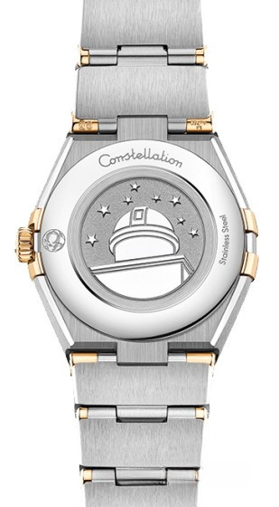 Характерными элементами выразительного и всегда актуального дизайна часов OMEGA Constellation являются узнаваемые полукруглые скосы вверху и внизу корпуса, боковые "скобки" и интегрированный браслет. Модель из 18-каратного желтого золота и нержавеющей стали имеет корпус диаметром 25 мм, инкрустированный бриллиантами безель, циферблат цвета шампанского с узором "солнечные лучи", бриллиантовые часовые индексы и устойчивое к царапинам сапфировое стекло. Стрелки, логотип OMEGA, звезда Constellation и оправа бриллиантов также выполнены из 18-каратного желтого золота. В часы установлен механизм OMEGA 4061, а их заднюю крышку украшает рельефный медальон с изображением обсерватории.