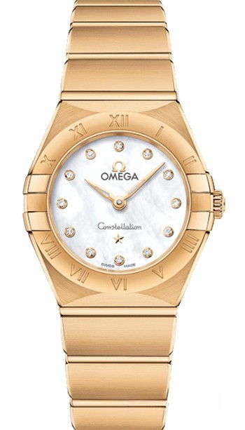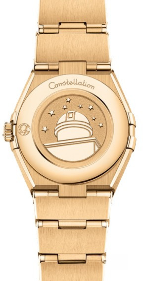 Характерными элементами выразительного и всегда актуального дизайна часов OMEGA Constellation являются узнаваемые полукруглые скосы вверху и внизу корпуса, боковые "скобки" и интегрированный браслет. Модель из 18-каратного желтого золота имеет корпус диаметром 25 мм, безель с выгравированными римскими цифрами, белый перламутровый циферблат с бриллиантовыми часовыми индексами и устойчивое к царапинам сапфировое стекло. Браслет, стрелки, логотип OMEGA, звезда Constellation и оправа бриллиантов также выполнены из 18-каратного желтого золота. В часы установлен механизм OMEGA 4061, а их заднюю крышку украшает рельефный медальон с изображением обсерватории.