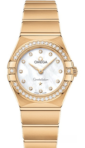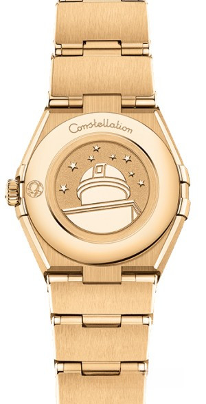 Характерными элементами выразительного и всегда актуального дизайна часов OMEGA Constellation являются узнаваемые полукруглые скосы вверху и внизу корпуса, боковые "скобки" и интегрированный браслет. Модель из 18-каратного желтого золота имеет корпус диаметром 25 мм, инкрустированный бриллиантами безель, белый перламутровый циферблат с бриллиантовыми часовыми индексами и устойчивое к царапинам сапфировое стекло. Браслет, стрелки, логотип OMEGA, звезда Constellation и оправа бриллиантов выполнены из 18-каратного желтого золота. В часы установлен механизм OMEGA 4061, а их заднюю крышку украшает рельефный медальон с изображением обсерватории.