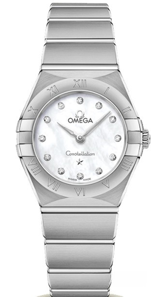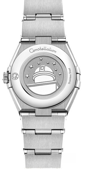 Характерными элементами выразительного и всегда актуального дизайна часов OMEGA Constellation являются узнаваемые полукруглые скосы вверху и внизу корпуса, боковые "скобки" и интегрированный браслет. Модель из нержавеющей стали имеет корпус диаметром 25 мм, безель с выгравированными римскими цифрами, белый перламутровый циферблат с бриллиантовыми часовыми индексами и устойчивое к царапинам сапфировое стекло. Стрелки, логотип OMEGA, звезда Constellation и оправа бриллиантов выполнены из 18-каратного белого золота. В часы установлен механизм OMEGA 4061, а их заднюю крышку украшает рельефный медальон с изображением обсерватории.