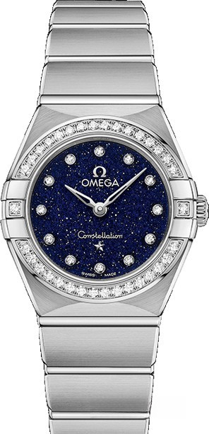 Характерными элементами выразительного и всегда актуального дизайна часов OMEGA Constellation являются узнаваемые полукруглые скосы вверху и внизу корпуса, боковые "скобки" и интегрированный браслет. Модель из нержавеющей стали имеет корпус диаметром 25 мм, циферблат из синего авантюрина с бриллиантовыми часовыми индексами и устойчивое к царапинам сапфировое стекло. В часы установлен механизм OMEGA 4061, а их заднюю крышку украшает рельефный медальон с изображением обсерватории. Часы комплектуются браслетом из нержавеющей стали. Безель из белых бриллиантов.