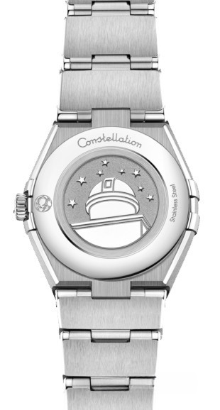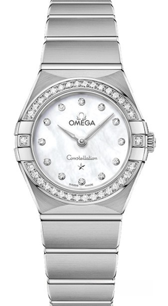 Характерными элементами выразительного и всегда актуального дизайна часов OMEGA Constellation являются узнаваемые полукруглые скосы вверху и внизу корпуса, боковые "скобки" и интегрированный браслет. Модель из нержавеющей стали имеет корпус диаметром 25 мм, инкрустированный бриллиантами безель, белый перламутровый циферблат с бриллиантовыми часовыми индексами и устойчивое к царапинам сапфировое стекло. Стрелки, логотип OMEGA, звезда Constellation и оправа бриллиантов выполнены из 18-каратного белого золота. В часы установлен механизм OMEGA 4061, а их заднюю крышку украшает рельефный медальон с изображением обсерватории.