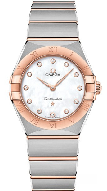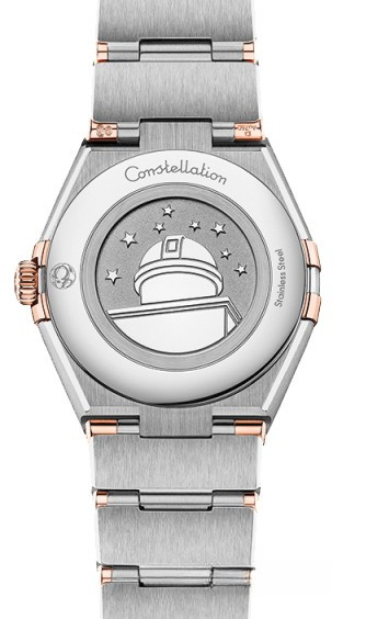 Характерными элементами выразительного и всегда актуального дизайна часов OMEGA Constellation являются узнаваемые полукруглые скосы вверху и внизу корпуса, боковые "скобки" и интегрированный браслет. Модель из 18-каратного золота Sedna™ и нержавеющей стали имеет корпус диаметром 28 мм, безель с выгравированными римскими цифрами, белый перламутровый циферблат с бриллиантовыми часовыми индексами и устойчивое к царапинам сапфировое стекло. Стрелки, логотип OMEGA, звезда Constellation и оправа бриллиантов также выполнены из 18-каратного золота Sedna™. В часы установлен механизм OMEGA 4061, а их заднюю крышку украшает рельефный медальон с изображением обсерватории.