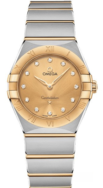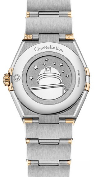 Характерными элементами выразительного и всегда актуального дизайна часов OMEGA Constellation являются узнаваемые полукруглые скосы вверху и внизу корпуса, боковые "скобки" и интегрированный браслет. Модель из 18-каратного желтого золота и нержавеющей стали имеет корпус диаметром 28 мм, безель с выгравированными римскими цифрами, циферблат цвета шампанского с узором "солнечные лучи", бриллиантовые часовые индексы и устойчивое к царапинам сапфировое стекло. Стрелки, логотип OMEGA, звезда Constellation и оправа бриллиантов также выполнены из 18-каратного желтого золота. В часы установлен механизм OMEGA 4061, а их заднюю крышку украшает рельефный медальон с изображением обсерватории.