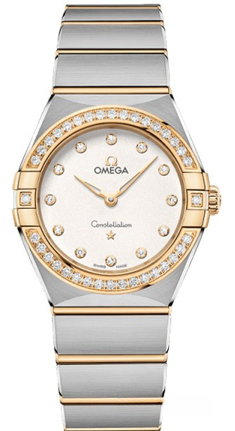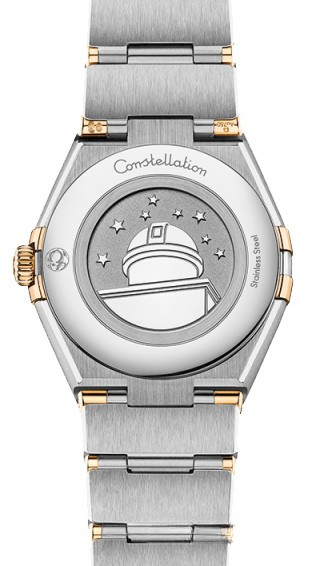 Характерными элементами выразительного и всегда актуального дизайна часов OMEGA Constellation являются узнаваемые полукруглые скосы вверху и внизу корпуса, боковые "скобки" и интегрированный браслет. Модель из 18-каратного желтого золота и нержавеющей стали имеет корпус диаметром 28 мм, инкрустированный бриллиантами безель, серебристо-белый циферблат с бриллиантовыми часовыми индексами и устойчивое к царапинам сапфировое стекло. Стрелки, логотип OMEGA, звезда Constellation и оправа бриллиантов также выполнены из 18-каратного желтого золота. В часы установлен механизм OMEGA 4061, а их заднюю крышку украшает рельефный медальон с изображением обсерватории.