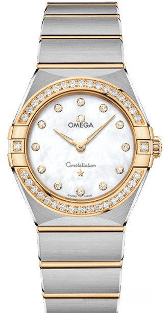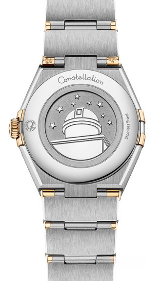 Характерными элементами выразительного и всегда актуального дизайна часов OMEGA Constellation являются узнаваемые полукруглые скосы вверху и внизу корпуса, боковые "скобки" и интегрированный браслет. Модель из 18-каратного желтого золота и нержавеющей стали имеет корпус диаметром 28 мм, инкрустированный бриллиантами безель, белый перламутровый циферблат с бриллиантовыми часовыми индексами и устойчивое к царапинам сапфировое стекло. Стрелки, логотип OMEGA, звезда Constellation и оправа бриллиантов также выполнены из 18-каратного желтого золота. В часы установлен механизм OMEGA 4061, а их заднюю крышку украшает рельефный медальон с изображением обсерватории.