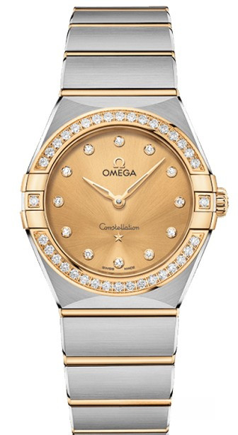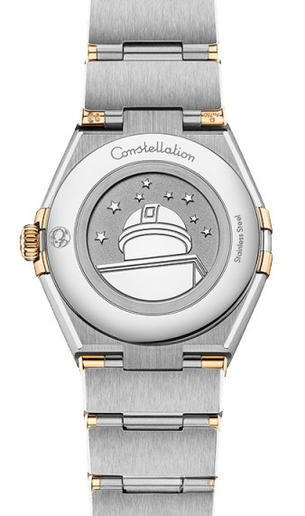 Характерными элементами выразительного и всегда актуального дизайна часов OMEGA Constellation являются узнаваемые полукруглые скосы вверху и внизу корпуса, боковые "скобки" и интегрированный браслет. Модель из 18-каратного желтого золота и нержавеющей стали имеет корпус диаметром 28 мм, инкрустированный бриллиантами безель, циферблат цвета шампанского с узором "солнечные лучи", бриллиантовые часовые индексы и устойчивое к царапинам сапфировое стекло. Стрелки, логотип OMEGA, звезда Constellation и оправа бриллиантов также выполнены из 18-каратного желтого золота. В часы установлен механизм OMEGA 4061, а их заднюю крышку украшает рельефный медальон с изображением обсерватории.