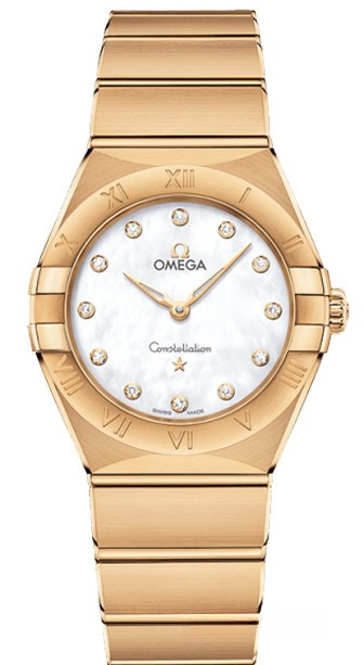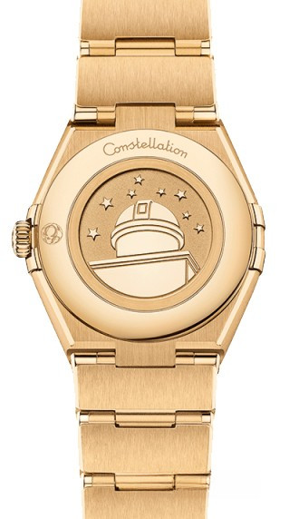 Характерными элементами выразительного и всегда актуального дизайна часов OMEGA Constellation являются узнаваемые полукруглые скосы вверху и внизу корпуса, боковые "скобки" и интегрированный браслет. Модель из 18-каратного желтого золота имеет корпус диаметром 28 мм, безель с выгравированными римскими цифрами, белый перламутровый циферблат с бриллиантовыми часовыми индексами и устойчивое к царапинам сапфировое стекло. Браслет, стрелки, логотип OMEGA, звезда Constellation и оправа бриллиантов также выполнены из 18-каратного желтого золота. В часы установлен механизм OMEGA 4061, а их заднюю крышку украшает рельефный медальон с изображением обсерватории.