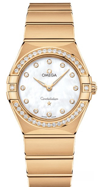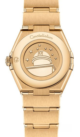 Характерными элементами выразительного и всегда актуального дизайна часов OMEGA Constellation являются узнаваемые полукруглые скосы вверху и внизу корпуса, боковые "скобки" и интегрированный браслет. Модель из 18-каратного желтого золота имеет корпус диаметром 28 мм, инкрустированный бриллиантами безель, белый перламутровый циферблат с бриллиантовыми часовыми индексами и устойчивое к царапинам сапфировое стекло. Браслет, стрелки, логотип OMEGA, звезда Constellation и оправа бриллиантов также выполнены из 18-каратного желтого золота. В часы установлен механизм OMEGA 4061, а их заднюю крышку украшает рельефный медальон с изображением обсерватории.